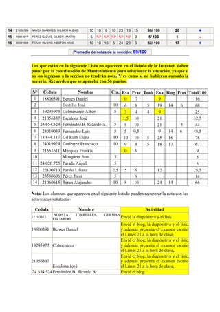 Este documento presenta las notas parciales de los estudiantes de la asignatura de Informática en el Programa Nacional de Formación en Mantenimiento. Incluye el plan de evaluación con 7 evaluaciones planificadas, la tabla con las calificaciones de los 16 estudiantes inscritos en las diferentes evaluaciones, y una lista de estudiantes que no aparecen en la intranet y deben resolver su situación para poder obtener una nota final.