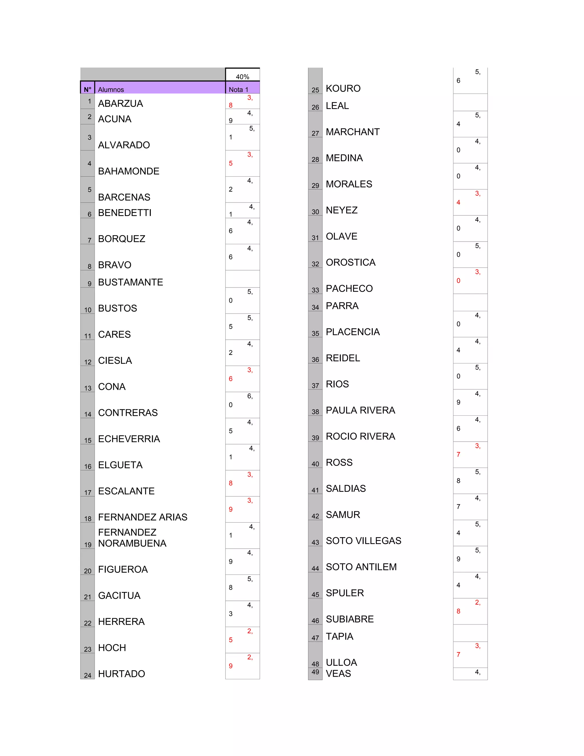 Este documento presenta los resultados de 54 alumnos en una prueba. Incluye el nombre de cada alumno, su nota en la prueba y el número de orden. El promedio general de notas fue de 3.