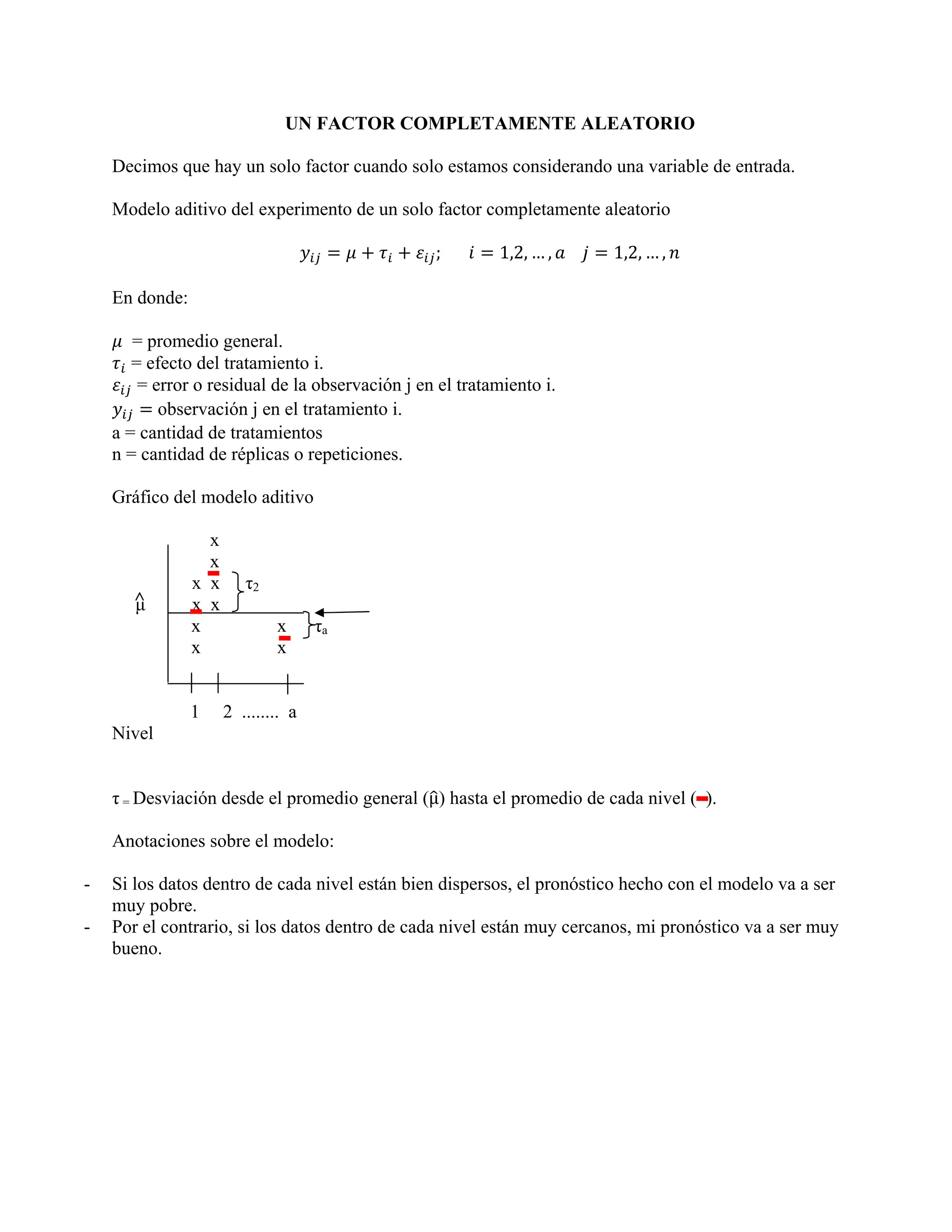 Este documento presenta los conceptos fundamentales del análisis de varianza (ANOVA) para un factor completamente aleatorio. Explica cómo se descompone la variabilidad total en variabilidad entre grupos y dentro de grupos, y cómo se utiliza la distribución F para determinar si al menos un grupo difiere significativamente de los demás. También cubre los supuestos de normalidad, homocedasticidad e independencia del ANOVA y métodos para evaluarlos.