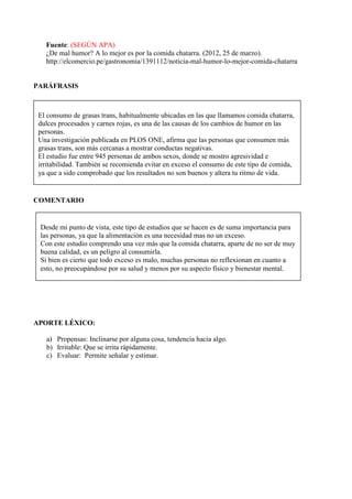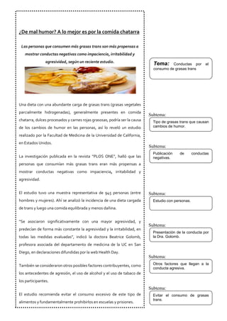 El resumen analiza cómo el consumo excesivo de grasas trans, presentes en comida chatarra, dulces procesados y carnes rojas, puede causar cambios de humor negativos como impaciencia e irritabilidad. Un estudio de la Universidad de California con 945 personas encontró que aquellos con una dieta alta en grasas trans tenían más probabilidades de mostrar conductas agresivas. El estudio recomienda evitar el consumo excesivo de este tipo de alimentos.