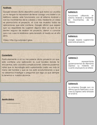 Google presentó el Proyecto Glass, unas gafas interactivas con conexión a internet que reemplazarán los teléfonos inteligentes y tabletas. El dispositivo funcionará mediante comandos de voz y movimientos oculares, dando acceso a aplicaciones y contenido. Aunque Google aún no confirma su fabricación, espera lanzarlo en 2013 si recibe comentarios positivos.
