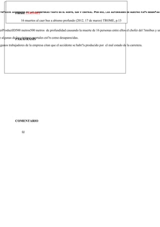 Un bus cayó a un abismo de 500 metros de profundidad en la región de Piura, Perú, matando a 16 personas incluyendo al conductor y una familia con un bebé de 2 años. Varios pasajeros resultaron heridos y fueron llevados a hospitales locales, mientras que los cuerpos de los fallecidos fueron trasladados a la morgue en Chulucanas. Algunos trabajadores creen que el accidente ocurrió debido al mal estado de la carretera.