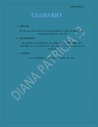 Este documento habla sobre OpenSSL, una API que proporciona encriptación de datos enviados entre computadoras en una red. También discute Heartbleed, una vulnerabilidad de seguridad en OpenSSL versión 1.0.1f que permitía leer la memoria de una computadora. Explica que OpenSSL se usa comúnmente para validar clientes de correo electrónico y transacciones en línea con tarjetas de crédito.
