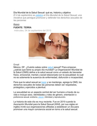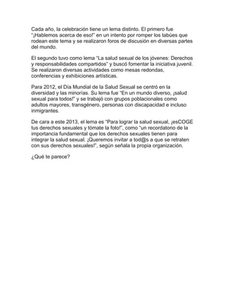 El Día Mundial de la Salud Sexual se celebra el 4 de septiembre para promover los derechos sexuales de las personas y crear conciencia sobre la importancia de la salud sexual. La Organización Mundial de la Salud define la salud sexual como un estado de bienestar físico, emocional y social relacionado con la sexualidad. La Asociación Mundial para la Salud Sexual estableció este día en 2010 para promover una mayor conciencia social sobre la salud sexual. Cada año se enfoca en un tema diferente como los derechos