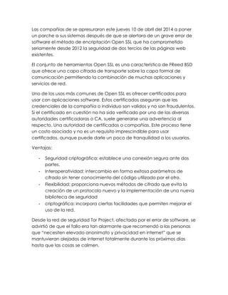 El documento habla sobre un grave error de software en el método de encriptación OpenSSL que ha comprometido la seguridad de dos tercios de las páginas web desde 2012. Las compañías de internet se apresuraron a poner un parche a sus sistemas después de alertarse sobre este error. El proyecto Tor advirtió que el fallo era tan alarmante que recomendó a las personas que necesitan privacidad mantenerse alejadas de internet durante unos días.