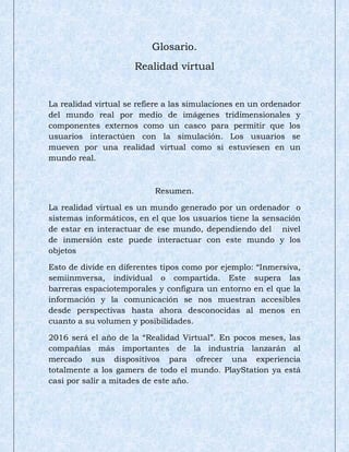 El documento describe la realidad virtual como simulaciones en 3D generadas por computadoras que permiten a los usuarios interactuar con un mundo virtual. Explica que la realidad virtual puede ser inmersiva, semi-inmersiva, individual o compartida y que supera las barreras espacio-temporales. Además, señala que en 2016 las principales compañías lanzarán dispositivos de realidad virtual al mercado, incluyendo un dispositivo de PlayStation a mitades de año.