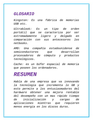 El documento habla sobre una empresa que está innovando la tecnología de discos duros. Ahora están incrementando la capacidad en GB, lo que permite a los entusiastas de hardware obtener mejoras en el rendimiento con tiempos de inicio y carga de aplicaciones más rápidos, requiriendo menos energía en los discos duros. El documento también incluye un glosario con definiciones de términos como Kingston, Ultrabook, AMD y caché.