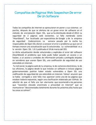 Las compañías de internet apresuraron a aplicar parches a sus sistemas después de que se alertara sobre un grave error de software en el método de encriptación OpenSSL que se ha usado desde 2012. El error, llamado "Heartbleed", permitía a los hackers acceder a información privada alojada en servidores que usaban OpenSSL. Muchas páginas webs populares como redes sociales, comercio electrónico y gobiernos podrían haber estado vulnerables y se recomendó no usar internet hasta que se solucionara.