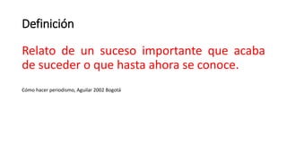 Este documento contiene definiciones y consejos sobre cómo escribir noticias. Explica que una noticia es un relato de un suceso importante y reciente. Define los elementos clave de una noticia como el título, el lead (párrafo de apertura) y el cuerpo. Resalta que el lead debe captar la atención del lector y resumir la información más relevante de forma atractiva. Además, cada párrafo del cuerpo debe aportar nuevos datos para mantener el interés del lector.