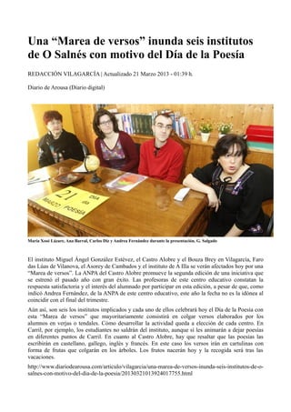Seis institutos de la zona de O Salnés celebrarán el Día de la Poesía con una "Marea de versos", una iniciativa impulsada por la ANPA del instituto Castro Alobre de Vilagarcía por segundo año consecutivo. Cada centro desarrollará la actividad de manera diferente, como colgando poesías escritas por los estudiantes en verjas o árboles en formato de frutas, o animando a dejar versos en diferentes puntos de la localidad aunque sin salir del instituto.
