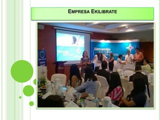 La empresa Ekililibrate tiene como objetivo lograr una mayor productividad mediante trabajadores sanos y entusiastas. Ofrece programas de salud que combinan las emociones y las relaciones para formar hábitos de cambio y mejorar el optimismo. También brinda asesoría para ayudar a los empleados a enfrentar retos laborales. La empresa se basa en cuidar la salud, las emociones, las relaciones sociales y la profesión de los trabajadores.