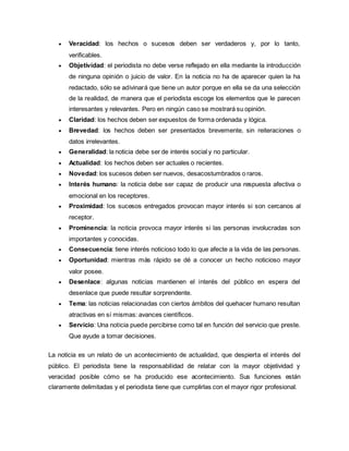 El documento habla sobre los estilos periodísticos y la noticia. Define la noticia como el relato de un hecho novedoso o atípico que merece ser informado por su relevancia social. Explica que una noticia debe responder a las 6 preguntas clásicas de periodismo (quién, qué, cuándo, dónde, por qué y cómo). También describe las principales características de una noticia como la veracidad, objetividad, brevedad, actualidad y novedad.
