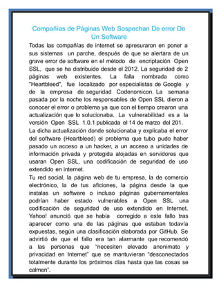Las compañías de internet apresuraron a aplicar parches a sus sistemas después de que se alertara sobre un grave error de software en el método de encriptación OpenSSL llamado "Heartbleed" que podría haber comprometido la seguridad y privacidad de los usuarios en sitios web que usaban OpenSSL. El error permitía a los hackers acceder a información privada alojada en servidores vulnerables. Se recomendó a los usuarios mantenerse desconectados de internet hasta que se corrigiera el problema.
