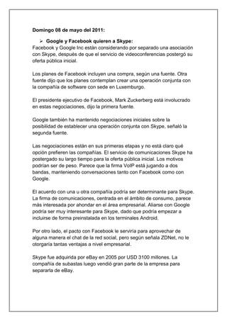 El documento presenta varias noticias tecnológicas. Habla sobre una computadora con estilo retro llamada Philco PC, los desafíos que enfrentó Apple para fabricar el iPhone 4 blanco como problemas con la cámara y el grosor, y que el modelo blanco estará disponible en varios países. También menciona que Facebook y Google están considerando asociarse con Skype y que existen varias fuentes potenciales de energía renovable como bacterias, sonido, algas, agua salada y plantas.