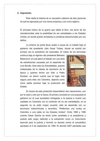 La obra "noticia de un secuestro" de Gabriel García Márquez explora los secuestros en Colombia durante los años 80, perpetrados tanto por narcotraficantes como por guerrillas, reflejando la angustia de las víctimas y sus familias. El texto narra un secuestro colectivo que ilustra la lucha entre el narcoterrorismo y el gobierno colombiano, y destaca los esfuerzos por liberar a las víctimas, incluyendo periodistas secuestrados. García Márquez, reconocido novelista y periodista, utiliza su experiencia para brindar una perspectiva profunda sobre el contexto político y social en Colombia.