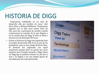 Digg es un sitio web sobre noticias de ciencia y tecnología donde los usuarios envían enlaces a artículos y los votan. Los artículos más votados aparecen en la portada del sitio. Digg fue fundado en 2004 por Kevin Rose y otros, aunque el dominio estaba registrado a nombre de un amigo para mantener en secreto su participación. Los usuarios pueden leer artículos, votarlos, comentarlos y publicarlos en sus blogs. Algunos han criticado a Digg por promover contenido de calidad variable e incluso publicidad encubiert