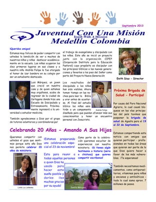 El documento habla sobre los logros académicos de los niños del ministerio y de un joven que se graduará de medicina. También menciona el trabajo de tutores voluntarios en el discipulado de los niños y la celebración de 20 años del ministerio. Solicita donaciones para una brigada médica y oraciones por el ministerio.