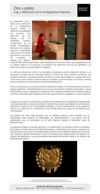El documento presenta información sobre las actividades y exposiciones del Museo de Cáceres en febrero de 2010. Incluye detalles sobre una exposición temporal de orfebrería hispana antigua llamada "Oro y plata. Lujo y distinción en la Antigüedad hispana", así como sobre un mosaico romano de la villa de El Olivar del Centeno. También anuncia las conferencias del mes y una excursión programada a Badajoz. Por último, proporciona cifras de visitantes del museo en 2009.