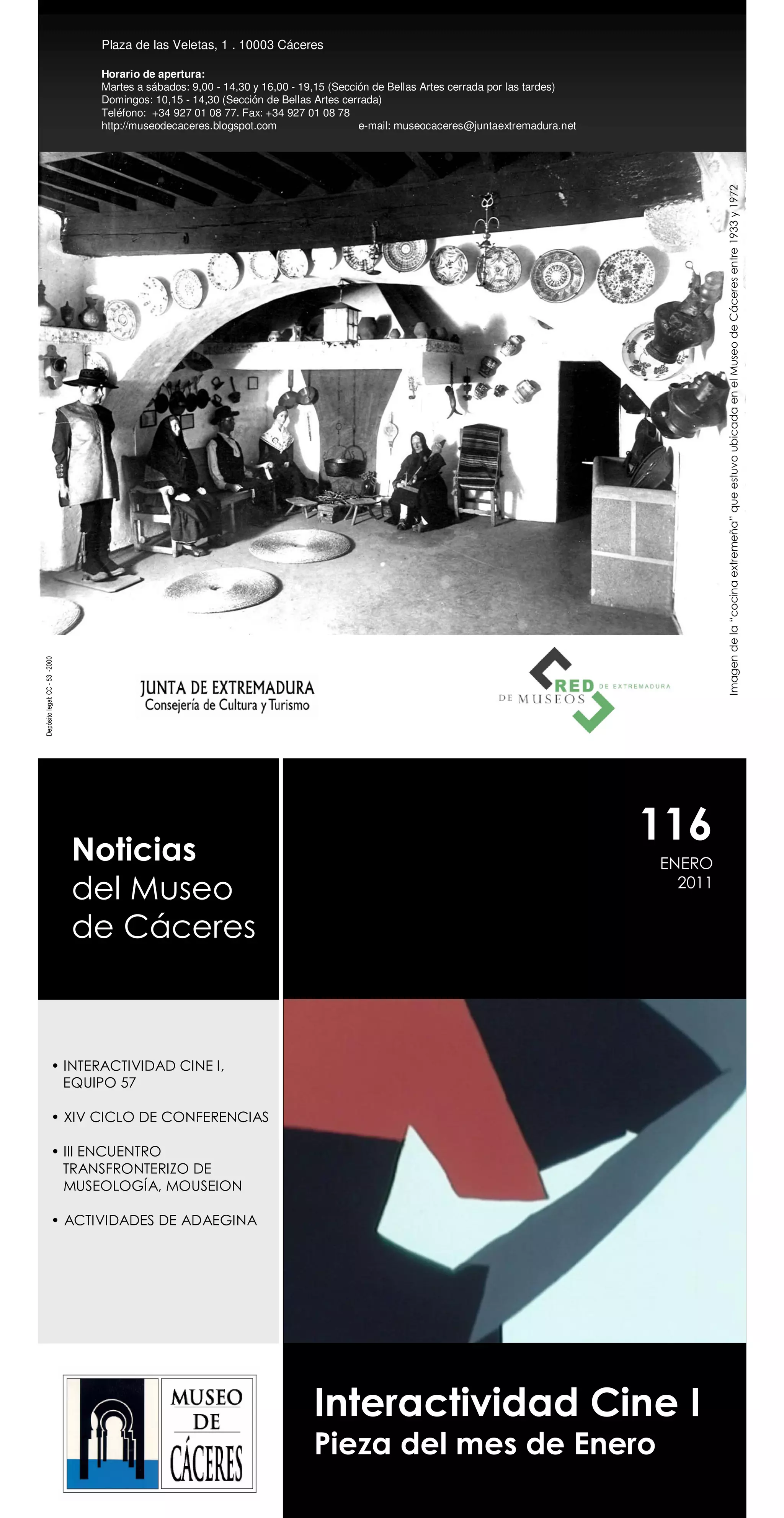 El documento presenta información sobre el Museo de Cáceres, incluyendo su horario, contacto y noticias recientes. Se destaca la pieza del mes "Interactividad Cine I" creada por el grupo Equipo 57 y se anuncian próximos eventos como conferencias y reuniones de asociaciones amigas del museo.