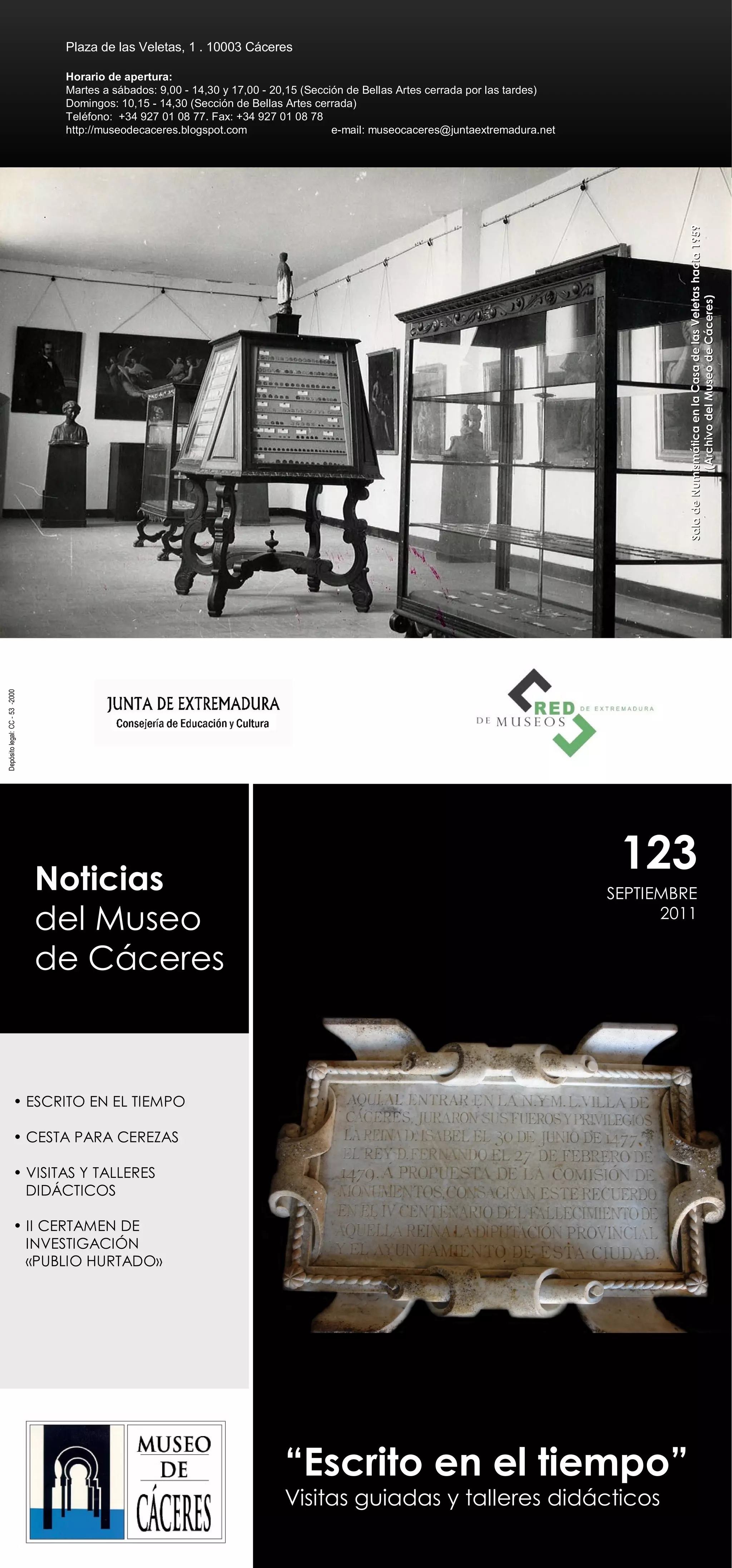 Este documento contiene información sobre las actividades y exposiciones del Museo de Cáceres. Incluye detalles sobre una exposición temporal llamada "Escrito en el tiempo" que explora la escritura en objetos de la colección del museo. También anuncia visitas guiadas a esta exhibición y talleres didácticos para estudiantes. Por último, proporciona detalles sobre el segundo certamen de investigación cultural "Publio Hurtado" patrocinado por la asociación de amigos del museo.