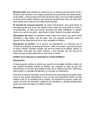 Este documento resume un noticiero de televisión de 2 horas de duración que cubre noticias, espectáculos, clima y deportes. Los conductores son un hombre y una mujer jóvenes que tratan de no parecer muy serios. La publicidad constituye alrededor de 30 minutos y aparece cada 15-20 minutos. Cerca del 90% del contenido son noticias. Los anuncios entre cortes promueven principalmente productos para la gripe y la revista Fama. El mercado objetivo parece ser personas de 30-40 años de clase popular.