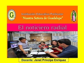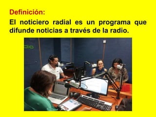 Un noticiero radial difunde noticias a través de la radio para mantener informado al público oyente sobre los hechos que suceden. Los locutores narran las noticias, realizan entrevistas y reciben llamadas del público, mientras que el público escucha las noticias. Para realizar un noticiero radial, los estudiantes deben organizarse en grupos para redactar y ensayar las noticias que presentarán con música o efectos de sonido y un presentador que anunciará el inicio del noticiero y los titulares.