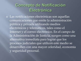 El documento discute las notificaciones electrónicas en el sistema judicial peruano. Explica que las notificaciones electrónicas pueden realizarse a través de una página web o correo electrónico y ofrecen una alternativa más rápida y económica que las notificaciones tradicionales. También describe cómo se implementaron por primera vez las notificaciones electrónicas en Perú en 2009 y los beneficios que aportan, como acelerar los procesos judiciales y reducir costos. Finalmente, concluye que las notificaciones electrónicas deb