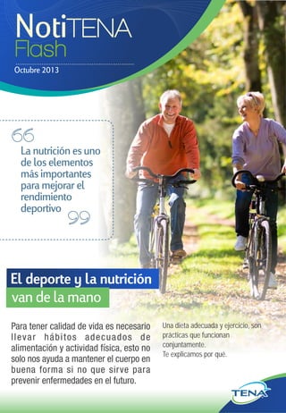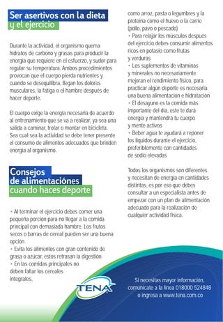 Este documento discute la importancia de una dieta balanceada y el ejercicio regular para el rendimiento deportivo y la salud en general. Explica que durante el ejercicio el cuerpo quema nutrientes y pierde líquidos, por lo que es necesario reponerlos a través de una alimentación que proporcione la energía adecuada. Ofrece consejos como comer frutas secas o cereales después del ejercicio, incluir carbohidratos, proteínas y frutas y verduras en las comidas principales, e hidratarse bien bebiendo