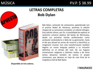 Este documento presenta novedades de enero de 2017 en música, sociología, narrativa, arte, fotografía y narrativa juvenil. Entre los libros destacados se encuentran la edición completa de las letras de Bob Dylan, un libro sobre mujeres solteras y la vida profesional femenina, y varias novelas incluyendo una sobre una familia excéntrica y otra que es la octava entrega de la saga Forastera. También se presentan libros de memorias, biografías y colecciones de fotografía.