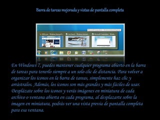El documento presenta las novedades de Windows 7, destacando mejoras en la barra de tareas, gestión de ventanas, y administración de dispositivos. Introduce características como las miniaturas en la barra y Jump Lists para un acceso rápido a archivos. También menciona mejoras en la administración de energía, compatibilidad con dispositivos y la funcionalidad de Windows Media Center.