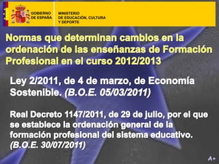 El documento describe la regulación de la formación profesional en España, detallando los requisitos de acceso a ciclos formativos de grado medio y superior, así como sus títulos y exenciones. Se establece la estructura educativa, incluyendo cursos de especialización y programas destinados a quienes carecen de cualificación profesional. Además, se menciona la convalidación de módulos y requisitos para obtener títulos de técnico y técnico superior, permitiendo el acceso a estudios universitarios.