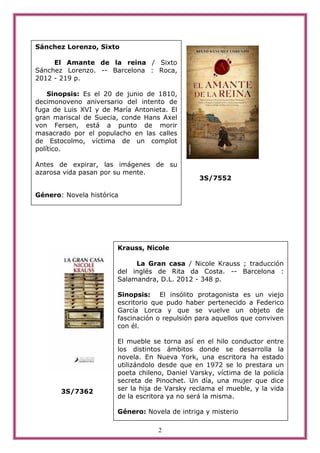 El documento presenta una lista de novedades literarias de octubre de 2012, incluyendo novelas históricas, de intriga y autobiografías. Destacan autores como Sixto Sánchez Lorenzo, Nicole Krauss y Richard Ford, quienes exploran diversas temáticas y estilos narrativos. Cada obra es acompañada por una sinopsis que resume su contenido y género.