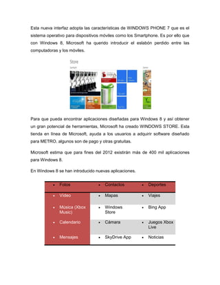 Este documento proporciona una introducción a las principales características y cambios en la interfaz de usuario de Windows 8 en comparación con versiones anteriores. Presenta la nueva interfaz Metro, la Pantalla de Inicio, el Escritorio de Windows, el inicio de sesión con PIN o contraseña de imagen, y describe aplicaciones predeterminadas como Fotos, Música y Mapas. También explica elementos como la barra de tareas, los íconos y el fondo de escritorio.