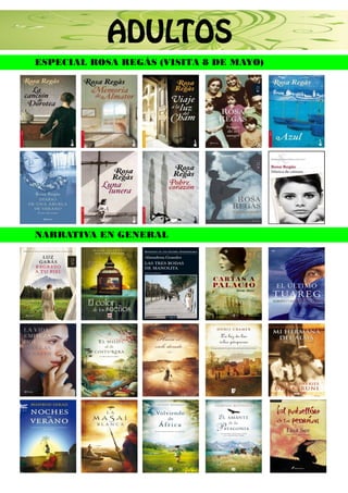 El documento es un boletín de novedades de la Biblioteca Pública Municipal "Feliciano Gracia" de Gallur (Zaragoza). Anuncia una visita especial el 8 de mayo sobre la autora Rosa Regás y lista varios géneros literarios como novela de intriga, novela romántica/erótica, novela histórica y varias temáticas. Finalmente, invita a los lectores a pasar por la biblioteca que se encuentra en la calle Baja número 2.