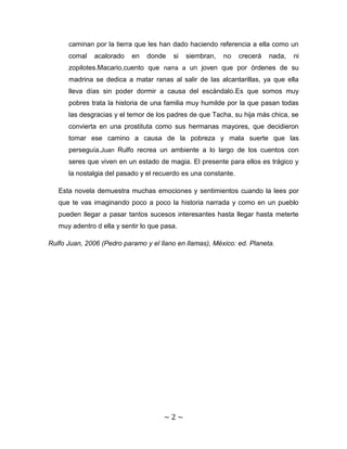 La novela Pedro Páramo y El llano en llamas de Juan Rulfo describe la vida de los campesinos en Jalisco a través de dos historias. La primera sigue a Pedro Páramo y sus anécdotas en un pueblo fantasma llamado Comala. La segunda parte narra las experiencias de Pedro Páramo a través de una serie de cuentos sobre la tierra árida. Rulfo recrea un ambiente trágico donde los personajes viven en un estado mágico, atormentados por el pasado.