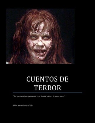 Este documento presenta dos cuentos de terror. El primer cuento, "La Niña Perdida", trata sobre dos hermanos que escuchan la voz de una niña en su radio. Llaman a expertos en comunicación con espíritus, quienes logran reunir a la niña con su abuela fallecida. El segundo cuento, "Bloody Mery", cuenta la historia de una niña asesinada por su hermano y su espíritu que aparece si se dice su nombre frente al espejo a medianoche con una vela encendida.