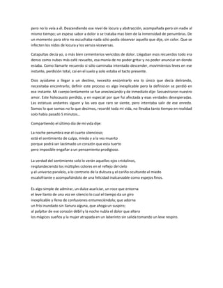 El documento es un relato en primera persona sobre una mujer que conoce a un hombre en la cafetería donde tomaba café para mantenerse despierta durante largas jornadas de trabajo agotadoras. Se enamoran profundamente en pocos meses, pero durante un ataque armado al Palacio de Justicia donde se encontraban, el hombre desaparece repentinamente, dejándola sumida en la desesperación y el dolor por no saber de su paradero. Al final, la mujer queda atrapada y herida en el ataque, delirando sobre su amor perdido.