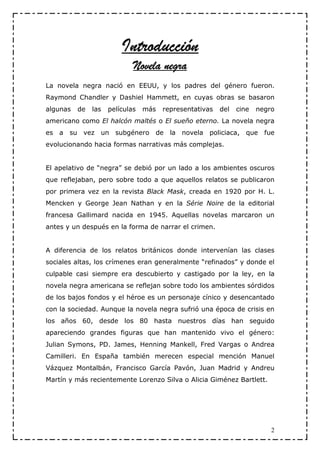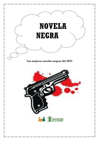 Este documento presenta una introducción a la novela negra como género literario, destacando sus orígenes en Estados Unidos y autores fundacionales como Chandler y Hammett. Luego propone un catálogo de las mejores novelas negras de 2012, incluyendo sinopsis y biografías de autores. El documento concluye con un índice alfabético de los autores incluidos en el catálogo.