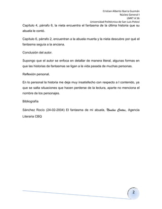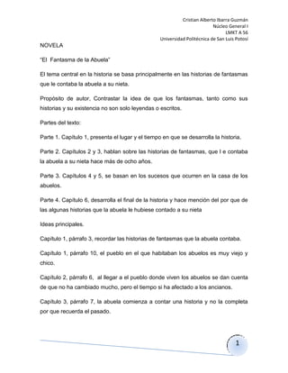 El documento resume la trama de la novela corta "El Fantasma de la Abuela". Narra cómo la abuela le contaba historias de fantasmas a su nieta hace 8 años, y ahora la nieta visita a la abuela en su pueblo natal. La historia se divide en 4 partes y 6 capítulos que describen las historias de fantasmas y eventos paranormales que ocurren en la casa de los abuelos. Al final, la nieta descubre por qué el fantasma perseguía a su abuela. El autor parece enfocarse en vincular las historias de fantasmas
