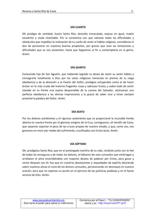 Este documento presenta una novena a Santa Rita de Casia. Consiste en oraciones diarias para cada uno de los nueve días, que describen la vida ejemplar de Santa Rita como doncella, esposa, madre y monja. También incluye gozos y oraciones finales dedicadas a pedir la intercesión de Santa Rita.