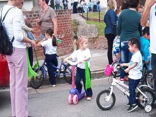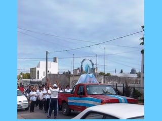 El documento habla sobre la historia de la Virgen de Luján y cómo prepara los corazones. Describe una bendición del párroco para hacer una celebración en el barrio, con familias participando con dedicación y alegría. También menciona cómo la comunidad pasa frente a la escuela oficial y la unidad carcelaria, y cómo todo elemento es válido para participar venerando a la Virgen en una fiesta de alegría familiar por el barrio.