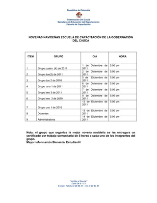Este documento presenta el programa de novenas navideñas para la Escuela de Capacitación de la Gobernación del Cauca en Colombia. El programa incluye 8 eventos que se llevarán a cabo del 1 al 14 de diciembre de 2011 a las 5:00 pm para diferentes grupos de estudiantes, docentes y administrativos. El grupo que organice la mejor novena navideña recibirá un certificado por trabajo comunitario de 5 horas para cada integrante.