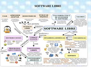 El documento habla sobre el software libre. Explica que en las décadas de 1960 y 1970 los programadores compartían libremente sus programas. Luego introduce a Richard Stallman, fundador de la Free Software Foundation y creador del concepto de software libre. Define el software libre como aquel que le da a los usuarios la libertad de ejecutar, copiar, distribuir, estudiar, cambiar y mejorar el software, con cuatro libertades específicas: usar el programa para cualquier propósito, estudiar y adaptar cómo funciona, distribuir copias para ayudar a otros,