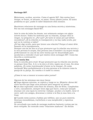 Este documento describe 7 teorías para explicar por qué algunas parejas mantienen relaciones secretas. La Teoría Dos sugiere que uno de los miembros de la pareja está siendo infiel. La Teoría de la Prueba-Error plantea que uno solo está probando la relación sin compromiso. La Teoría del Pasado propone que ocultan la relación por miedo a fracasar como en el pasado.
