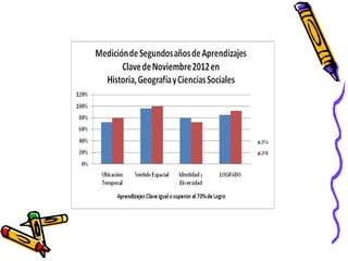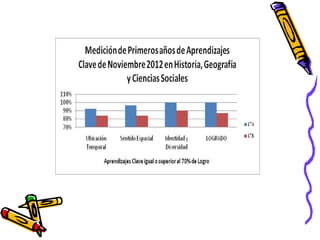 Este documento presenta los resultados de una evaluación de Historia, Geografía y Ciencias Sociales realizada en noviembre de 2012 a estudiantes de 5° a 8° año básico en la Escuela República de Grecia. Reporta el porcentaje de estudiantes que lograron el 70% o más, y los que no lograron ese puntaje mínimo, desglosados por curso y áreas evaluadas (Ubicación temporal, Sentido espacial, Identidad y diversidad).