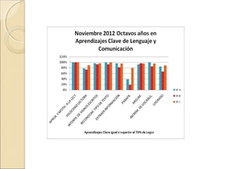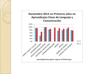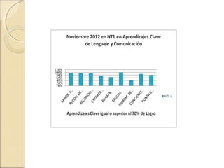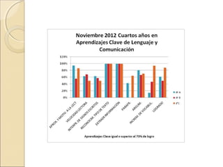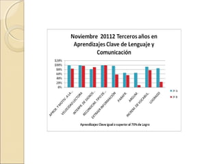 Este documento presenta los resultados de una evaluación de aprendizaje clave de lenguaje y comunicación aplicada a estudiantes de diferentes niveles educativos. Se muestran los porcentajes de estudiantes que lograron o no el 70% de exigencia en cada una de las categorías evaluadas. Adicionalmente, se presentan tablas detalladas con los puntajes obtenidos por cursos en las diferentes categorías evaluadas.