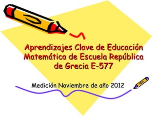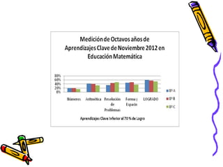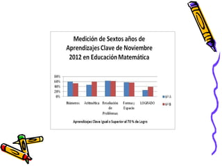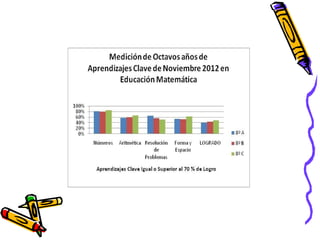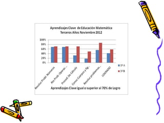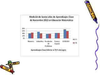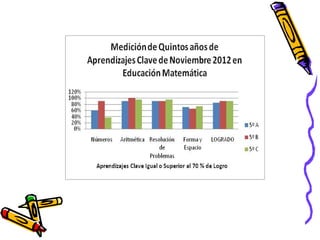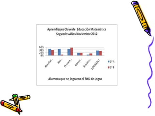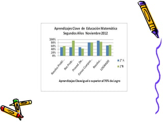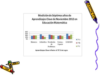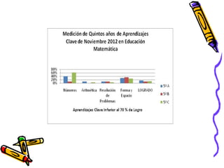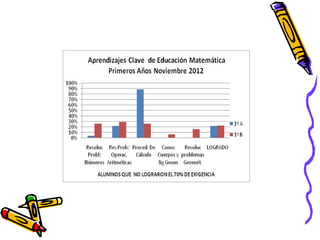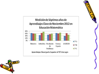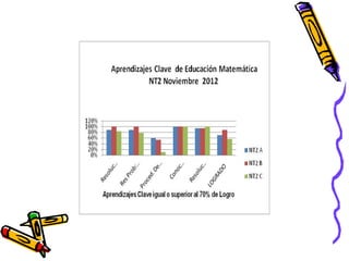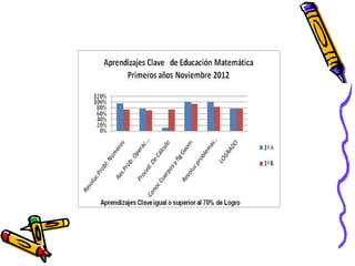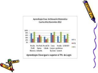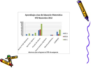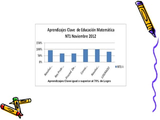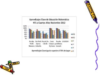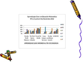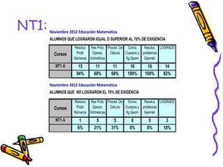 El documento presenta los resultados de una evaluación de matemáticas de noviembre de 2012 para alumnos de NT1 a 4o año en una escuela. Muestra el porcentaje de alumnos que lograron y no lograron el 70% de exigencia en diferentes áreas como números, operaciones y resolución de problemas. En general, alrededor del 74% de alumnos lograron la exigencia mientras que 26% no lo lograron, siendo los años iniciales los que tuvieron mayores porcentajes de éxito.