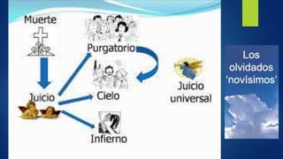 Este documento trata sobre los novísimos, que son los temas relacionados con lo que sucede después de la muerte. Se discuten temas como la muerte, el juicio particular, el cielo, el infierno y la vida eterna. Se citan las enseñanzas de Jesús, los papas y santos sobre estos asuntos importantes que todos debemos considerar.