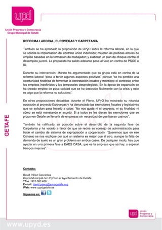 El pleno del Ayuntamiento de Getafe ha aprobado las propuestas de UPyD para eliminar barreras arquitectónicas y crear accesos peatonales al barrio de Los Molinos, así como mantener la gestión actual de las piscinas de Getafe Norte hasta fin de año. También se ha respaldado la reforma laboral que incluye un contrato único indefinido y se ha expresado oposición al proyecto Eurovegas. Además, se ha solicitado un cambio en el sistema de expropiación para el desarrollo de Carpetania.