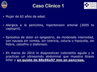 Este documento presenta el caso de una mujer de 62 años con antecedentes de alergia a penicilina e hipertensión arterial que acudió al hospital con episodios de dolor epigástrico moderado. Se le diagnosticó colecistitis aguda y litiasis biliar, así como un quiste pancreático de 88x96x97 mm. Después de someterse a una colecistectomía, presentó más dolor abdominal, por lo que fue enviada a otro hospital donde se le diagnosticó un pseudoquiste pancreático.